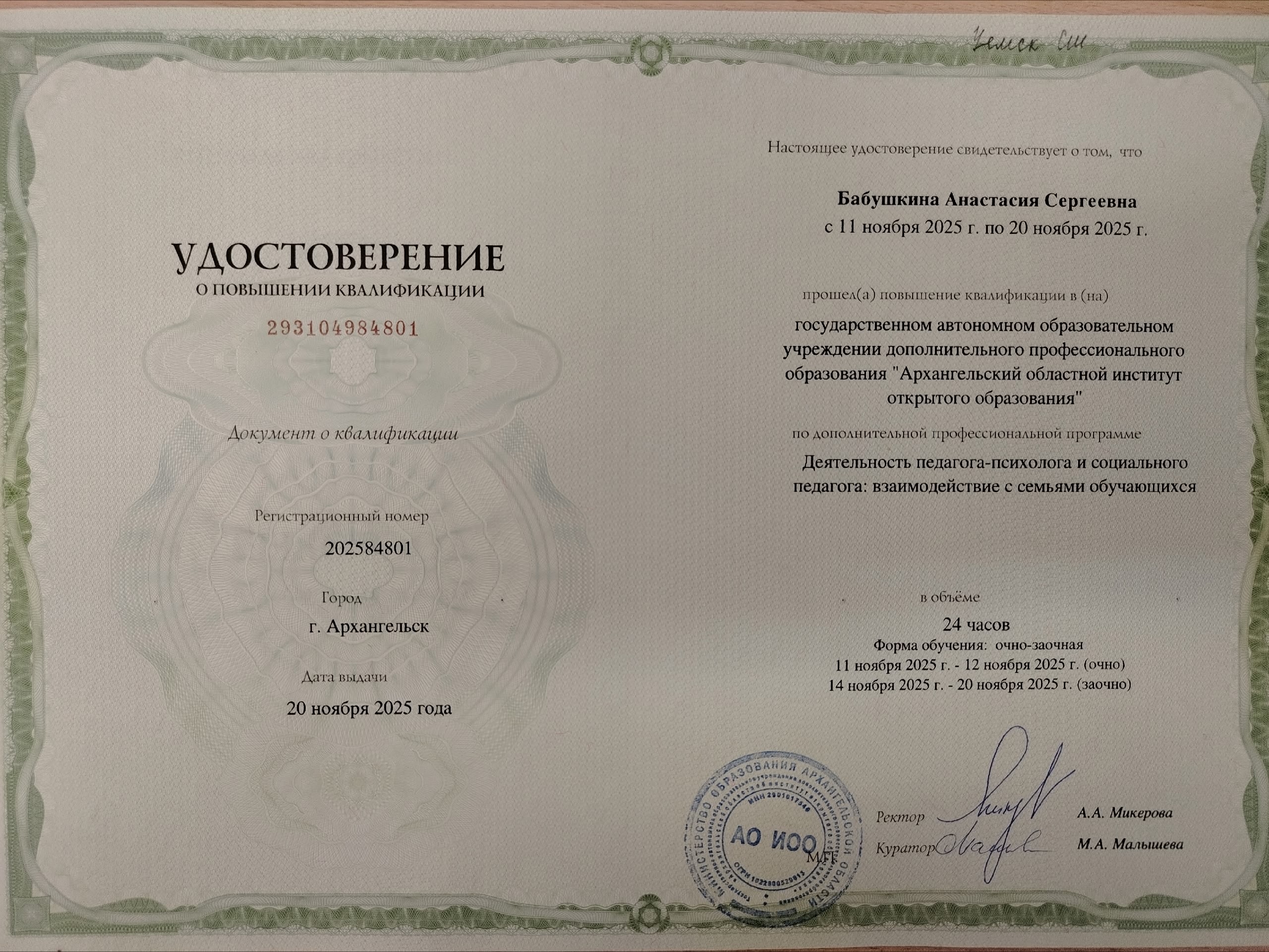 (ГАОУДПО "Архангельский областной институт открытого образования". 72часов. Форма обучения: очно.).